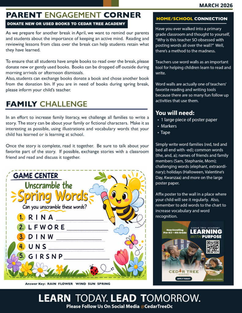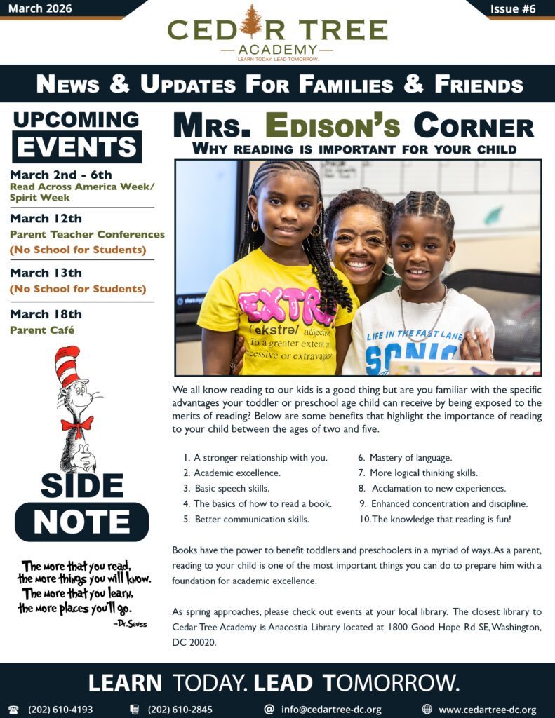 Books have the power to benefit toddlers and preschoolers in a myriad of ways. As a parent, reading to your child is one of the most important things you can do to prepare him with a foundation for academic excellence. As spring approaches, please check out events at your local library. The closest library to Cedar Tree Academy is Anacostia Library located at 1800 Good Hope Rd SE, Washington, DC 20020.